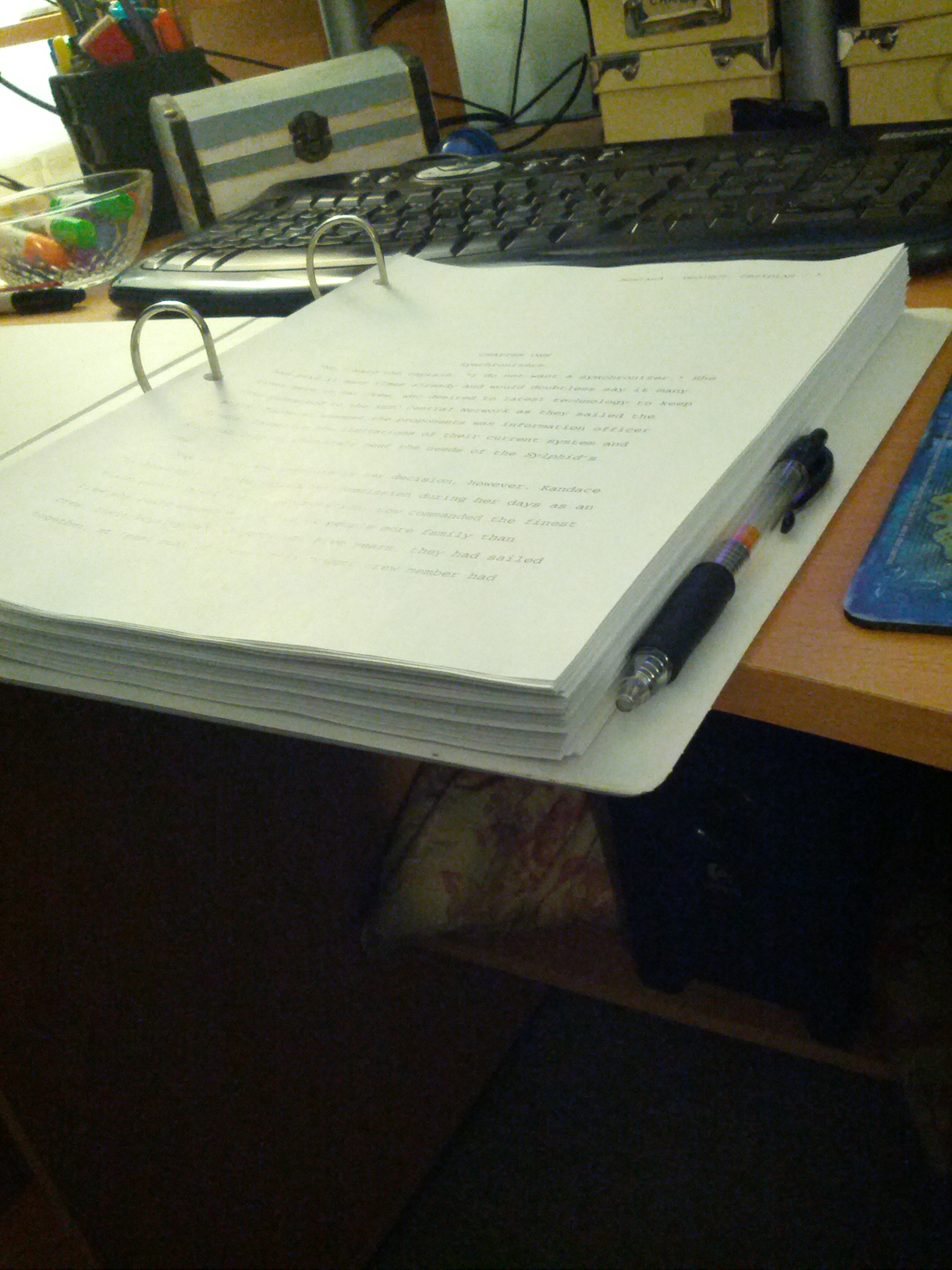 Lately, I’ve been printing out my novel a few chapters at a time, hoping to finish the first draft soon and begin editing. I haven’t made a decision yet as to whether I’ll set the work aside for a while before tackling Draft #2. I’d rather wait to see how I feel to see the whole thing printed out. This is what I’ve got so far, and it’s really awesome to see all of those pages sitting there. It’s roughly half the book, so knowing I’ll double that stack before I’m done is exciting.
